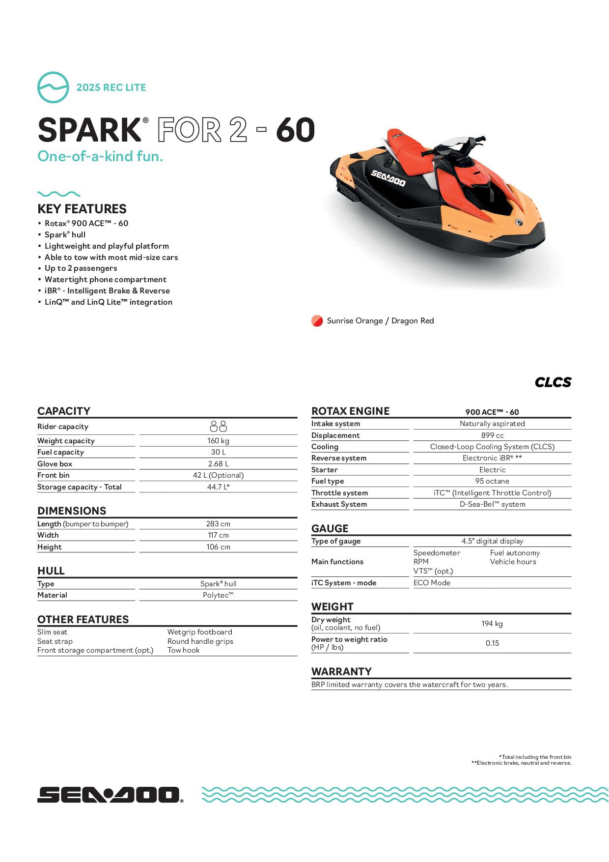 Spark jest skuterem dwuosobowym napędzany silnikiem Rotax o pojemności 900 cm3. Jest to skuter dostępny dla każdego miłośnika spędzania czasu na wodzie. Spark jest wyjątkowo przyjazny w obsłudze a jego silnik charakteryzuje się najniższym zużyciem paliwa. Rotax 900 to najbardziej ekonomiczny silnik dostępny na rynku skuterów wodnych. Umożliwia Sparkowi osiągnięcie maksymalnej szybkości ...