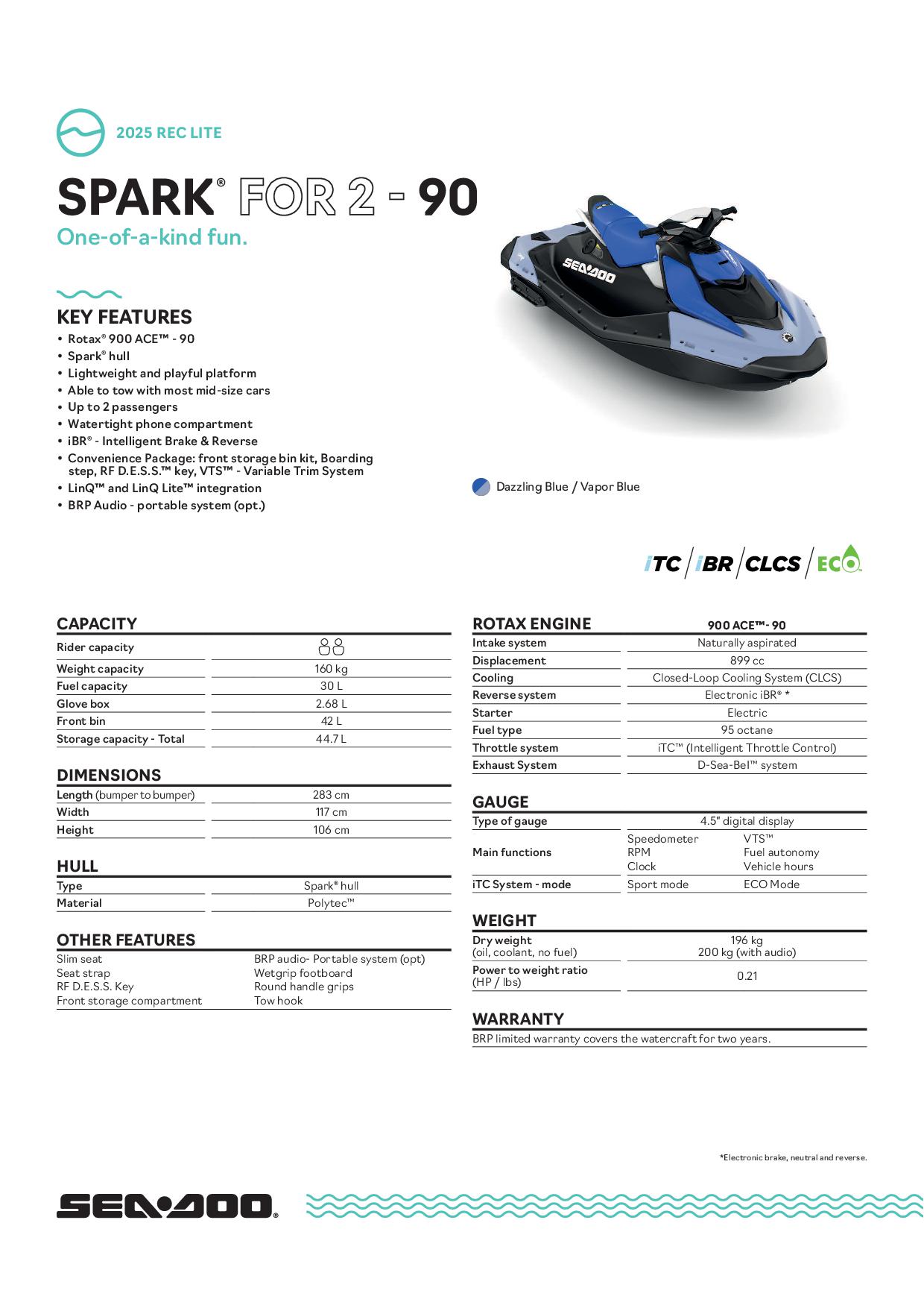 Spark jest skuterem dwuosobowym napędzany silnikiem Rotax ACE o pojemności 900 cm3. Jest to skuter dostępny dla każdego miłośnika spędzania czasu na wodzie. Spark jest wyjatkowo przyjazny w obsłudze a jego silnik charakteryzuje sie najniższym zużyciem paliwa. Rotax 900 ACE to najbardziej ekonomiczny silnik dostępny na rynku skuterów wodnych. Umożliwia Sparkowi osiagnięcie maksymalnej szyb...