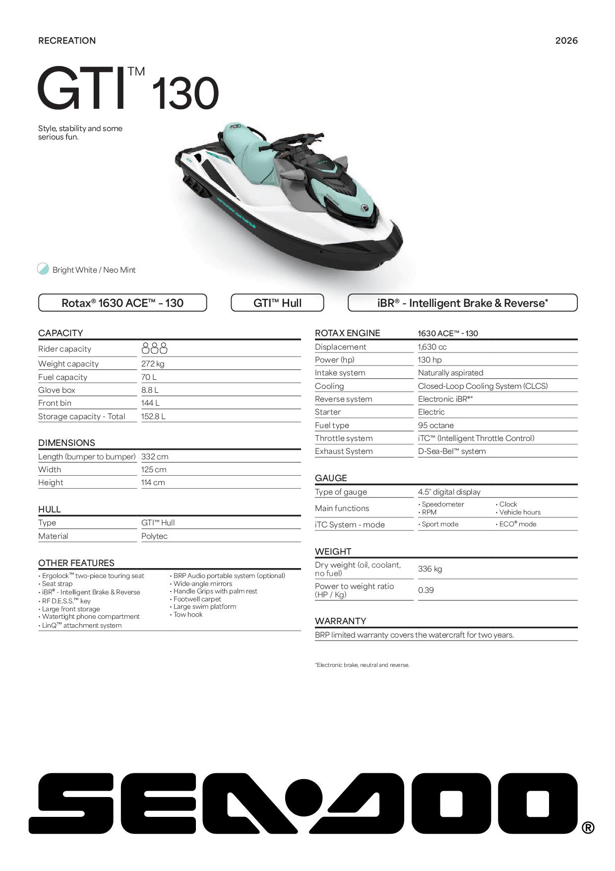 SEA DOO GTI 130 2026 to idealny skuter wodny dla osób szukających stylu, stabilności i pełnej frajdy. Wyposażony w niezawodny silnik Rotax® 1630 ACE™ – 130 KM oraz kadłub GTI® Hull z lekkiego materiału Polytec™, oferuje doskonałe połączenie osiągów, bezpieczeństwa i komfortu. To doskonały wybór na rodzinne wypady i rekreację nad wodą.