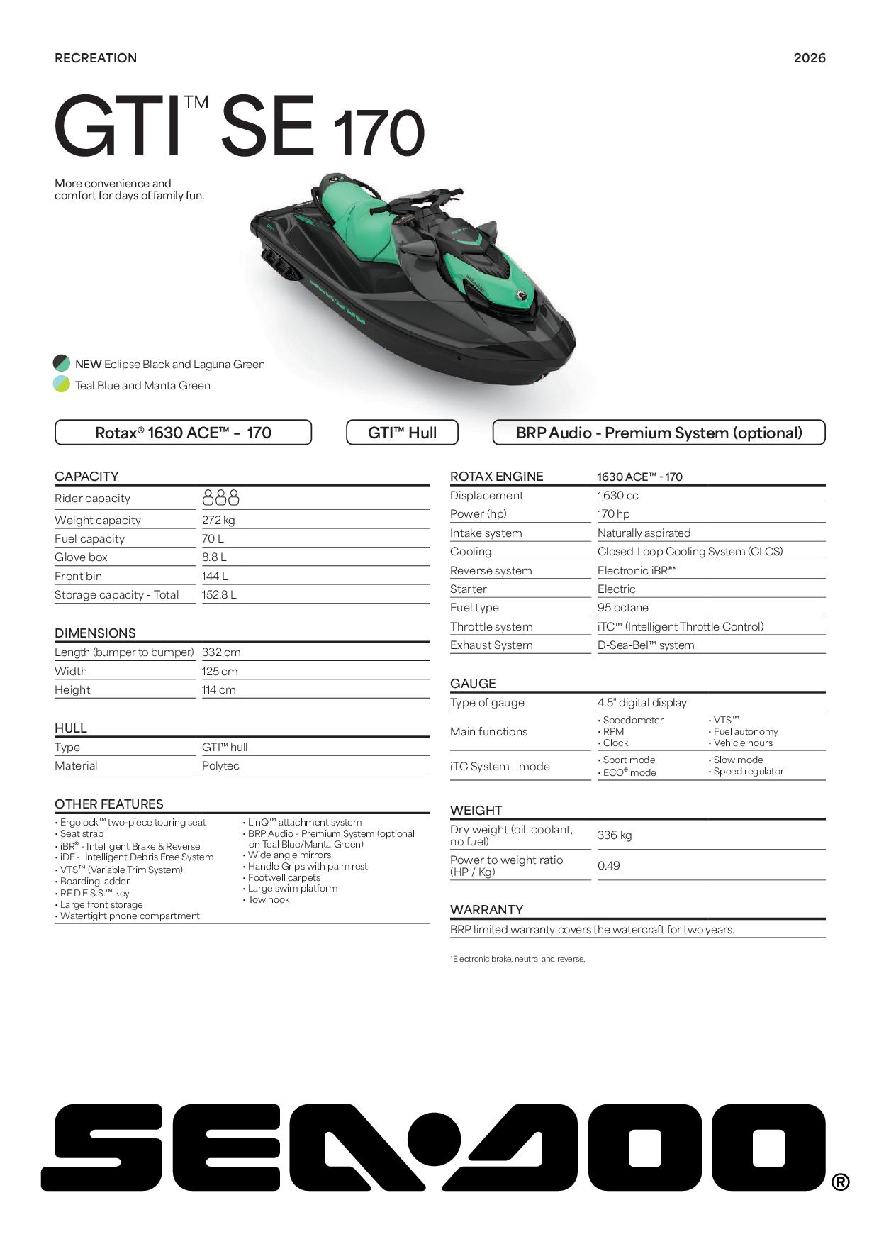 SEA DOO GTI SE 170 iDF iBR with Sound System 2026 to rodzinny skuter wodny, który łączy moc 170 KM z wygodą, funkcjonalnością i rozrywką. Dzięki niezawodnemu silnikowi Rotax® 1630 ACE™, nowoczesnemu kadłubowi GTI® Hull i wbudowanemu systemowi audio BRP Premium, każda wyprawa staje się jeszcze bardziej emocjonująca. To model stworzony dla osób, które cenią rekreację, komfort i zabawę na wodzie.